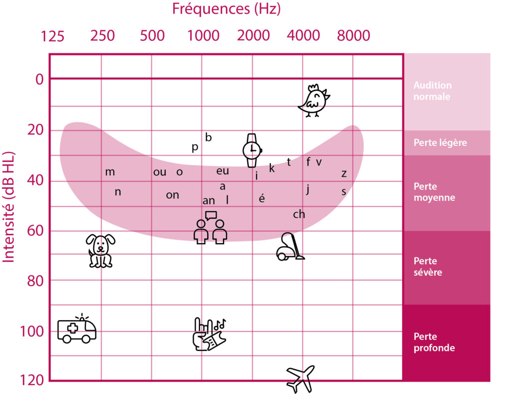 Selon le type de perte auditive, certains sons sont moins ou pas audibles (exemple : le chant des oiseaux, le tic-tac d’une montre, le bruit d’un aspirateur, un chien qui aboie, une ambulance qui passe, etc.). Sur le graphique ci-dessus, vous pouvez retrouver l’intensité et la fréquence de chacun de ces sons. Si la courbe d’audition se situe en-dessous de ceux-ci, cela signifie que les sons ne sont plus audibles par la personne. Si la courbe est au-dessus, en revanche, les sons en question seront toujours perceptibles.